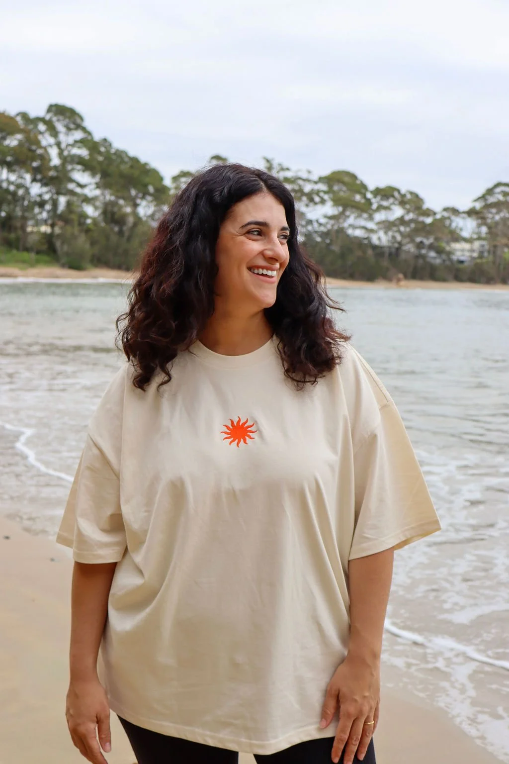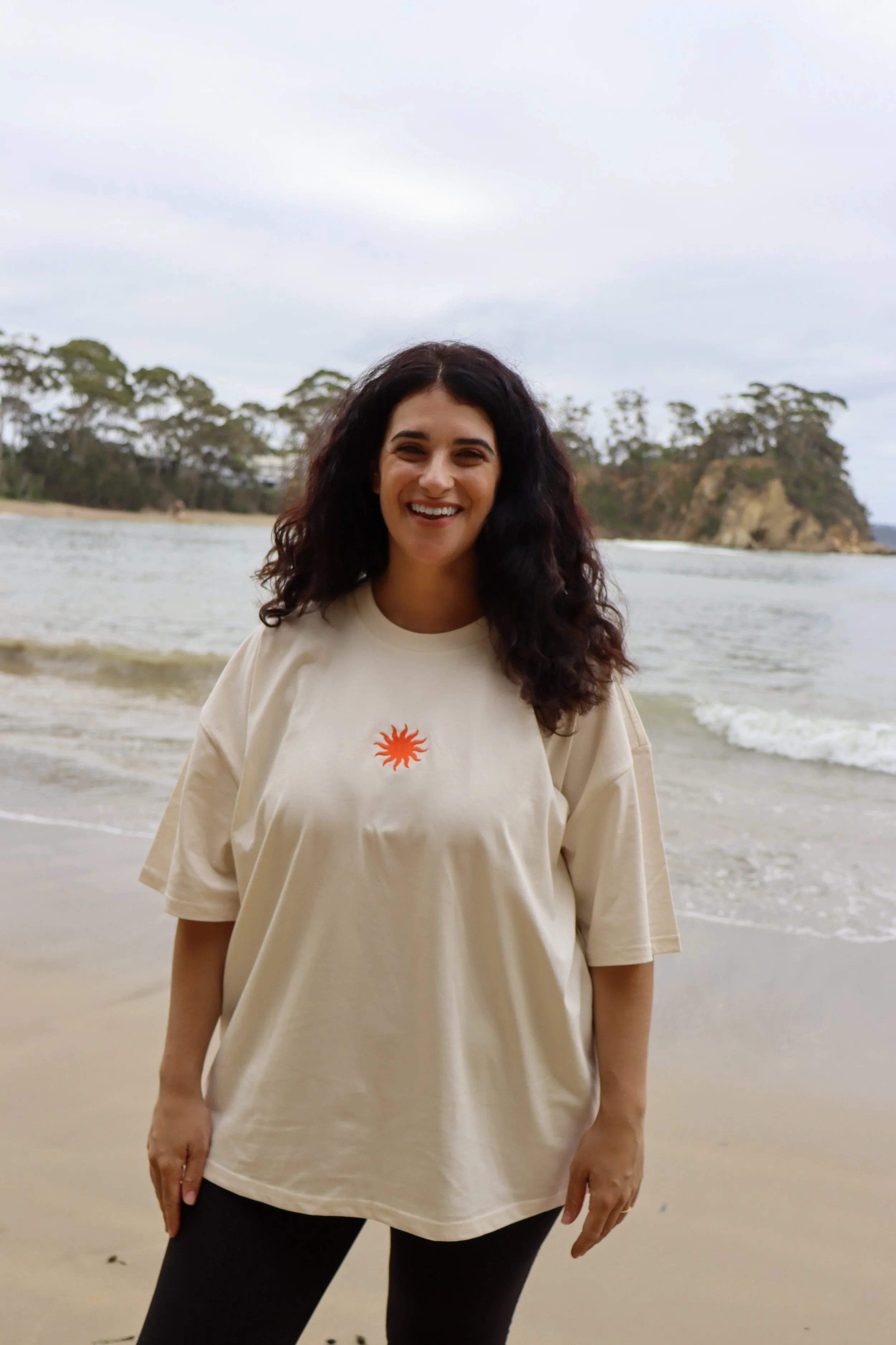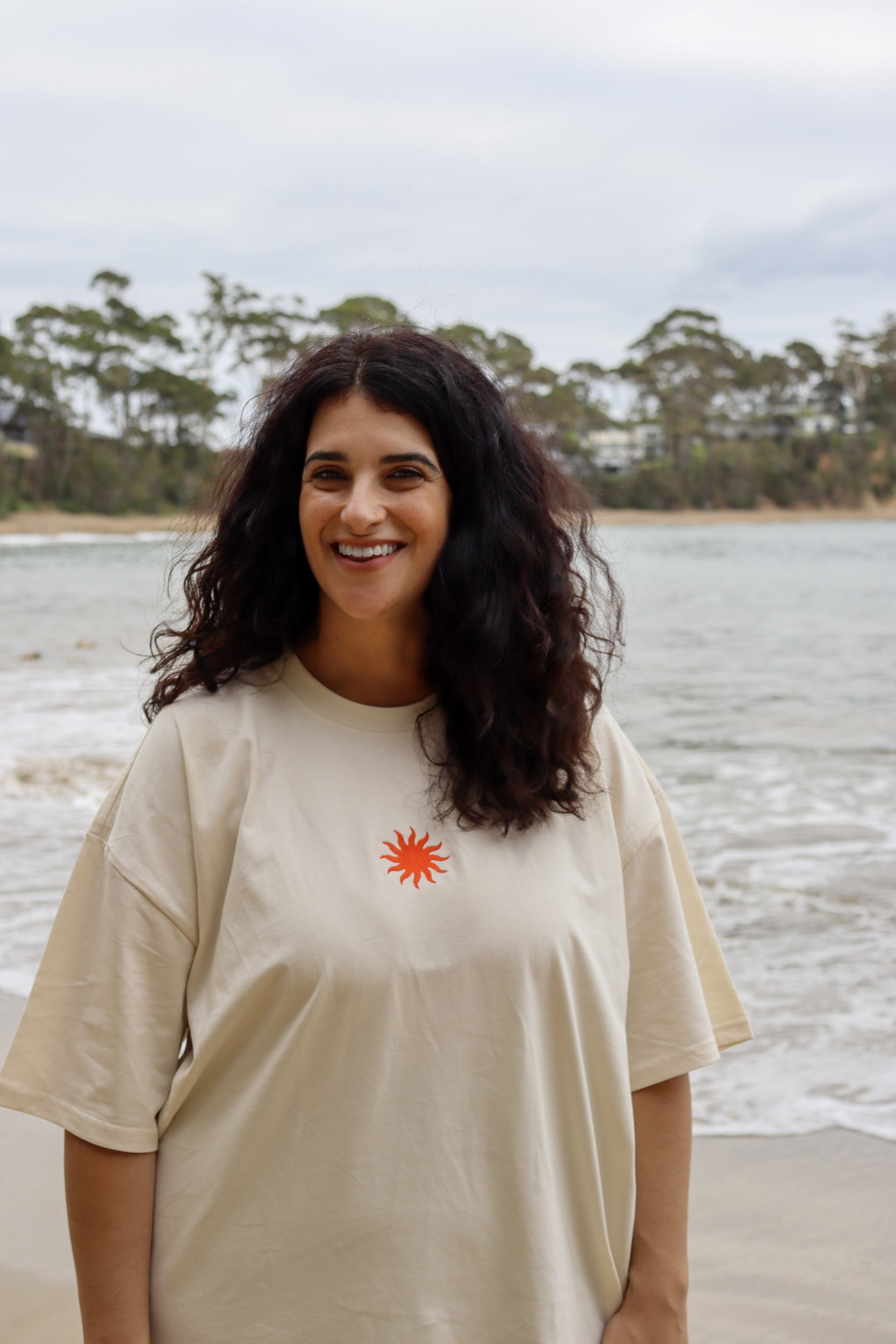 An oversized, relaxed tee with dropped shoulders. Made of heavy weight 220 GSM, 100% combed cotton in ecru colour, with red-orange embroidery and printing.